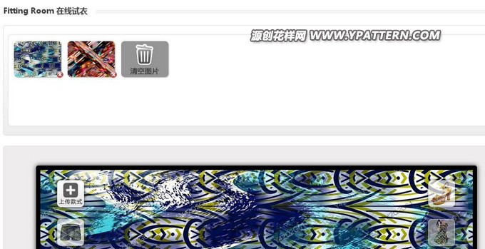 2.在試衣操作區(qū)的右下角,點擊ldquo;上傳花樣rdquo;按鈕,上傳你自己的花樣。上傳后的花樣,會在試衣操作區(qū)的上方顯示。