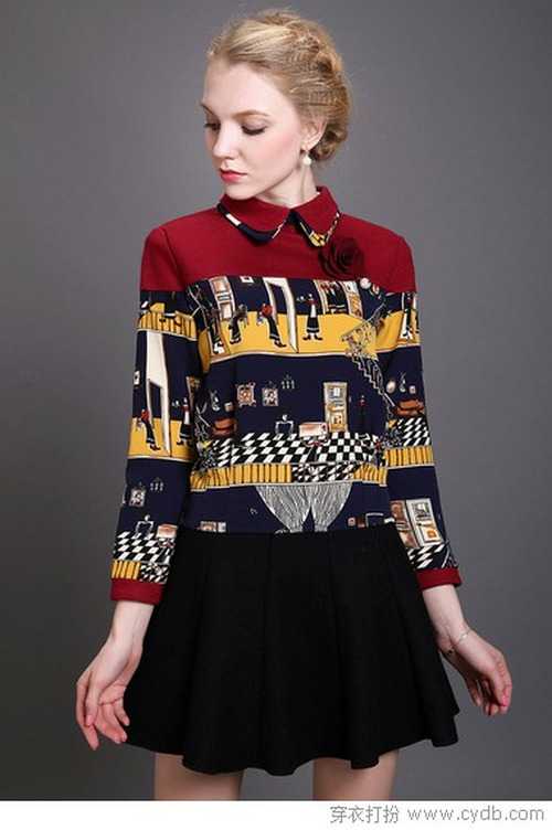 最后再更新一款印花打底衫吧,把客廳的景象都印染下來(lái),不按規(guī)矩出牌卻讓人覺(jué)得很是親切。娃娃翻領(lǐng)年輕了好幾歲,色彩雖然鮮艷但也劃分出好幾個(gè)層次,搭配黑色傘裙效果不賴。